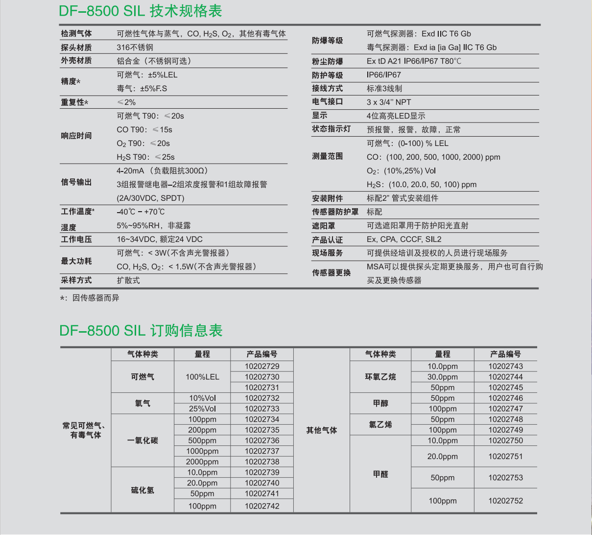 全新設計的DF-8500 有毒氣體探測器用于檢測現場環境硫化氫、一氧化碳、氧 氣氣體含量,采用基于特別設計的傳感器元件,可以有效降低多重背景氣體的交叉干 擾,提高響應速度,并有效減少環境溫度和濕度變化帶來的影響,探測器的設計基于國際先進標準,參考了北美和德國的長期經驗,具備極佳的抗電磁干擾能力,獲得了來自國際權威機構CSA的功能安全完整性(SIL)認證,賦予了產品極高的可靠性。