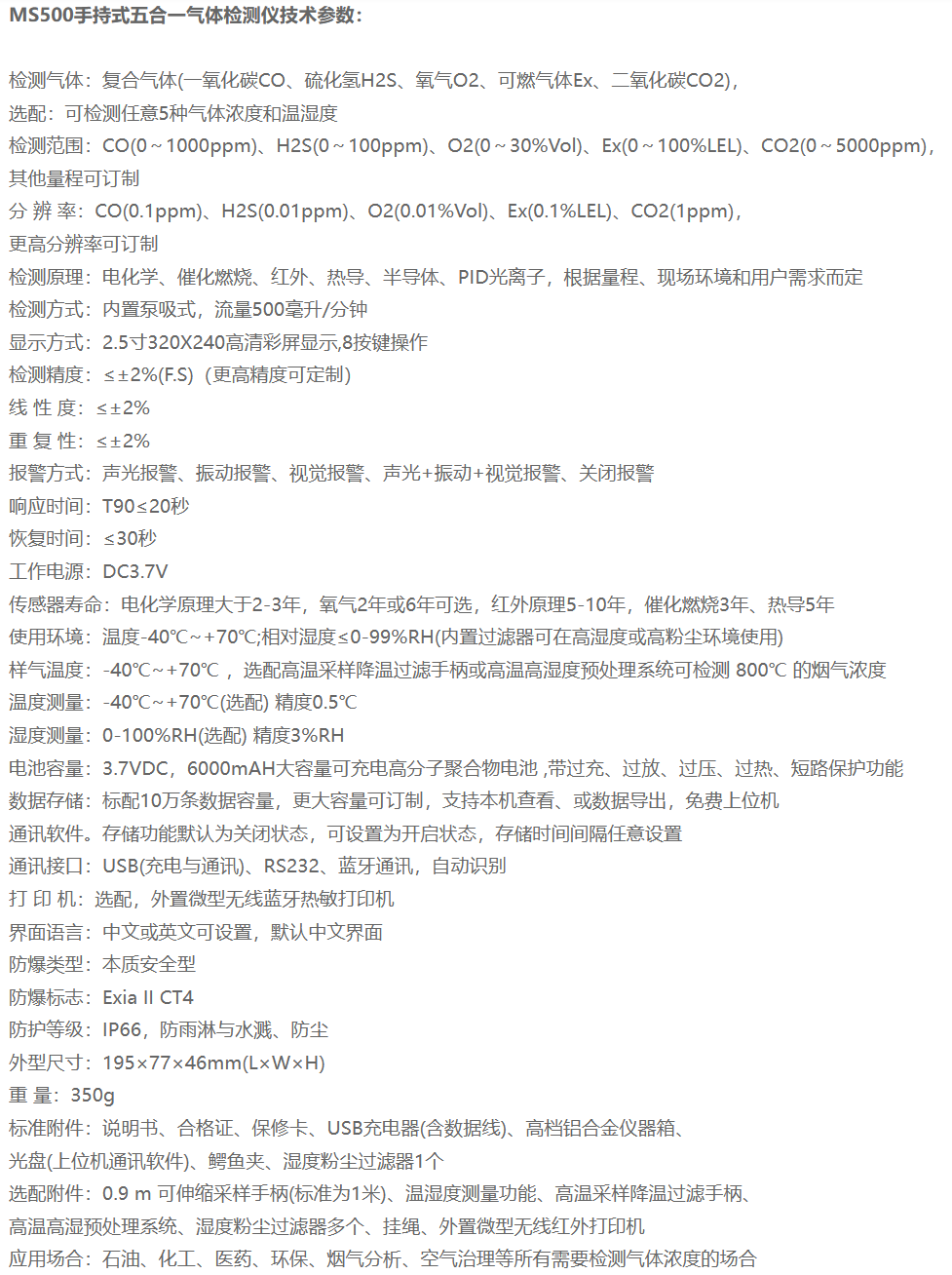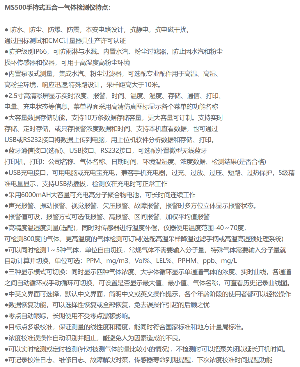 MS500手持式五合一氣體檢測儀用于快速檢測多種氣體濃度、溫濕度測量并超標報警的場合。